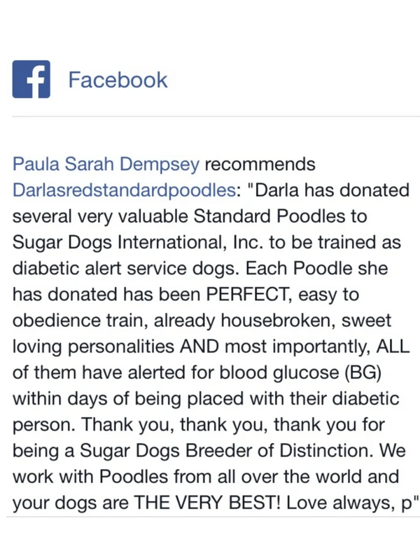 It's with great pleasure and reward that I donate my Red Standard Poodles to Sugar Dogs International. I have many family members both young and old who suffer from diabetes Type I & II. I desire to make a difference in someones life and even save someone's life. God Bless Sugar Dogs International.